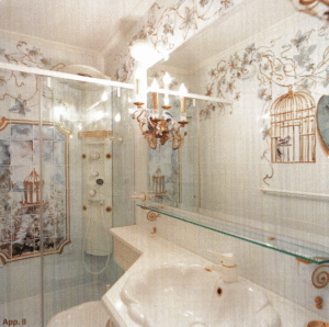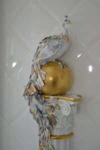 Nun wurden diese Bäder ausgestattet (sowohl die Wände als auch der Fußboden) mit hochfeinem Hartporzellan, dass bei 1420 °C gebrannt wird. Von Hand wurden die Objekte mit stimmungsvoll lasierenden Unterglasurfarben bemalt, wertvolle Goldmalerei unterstreicht den Charakter.